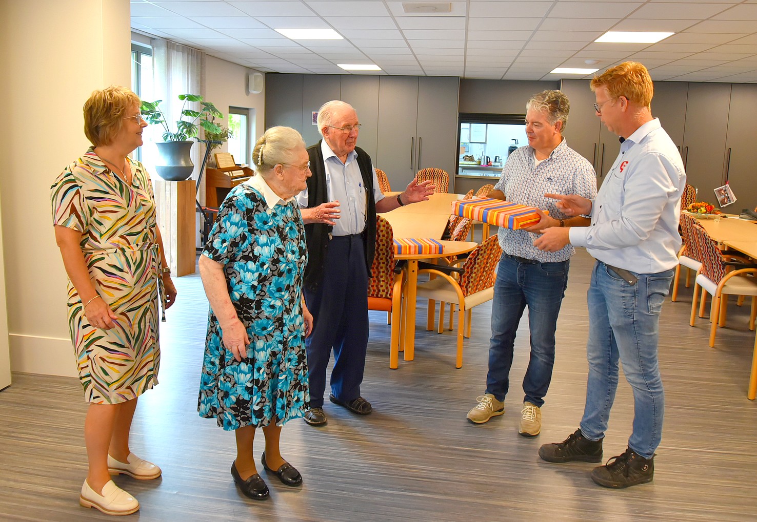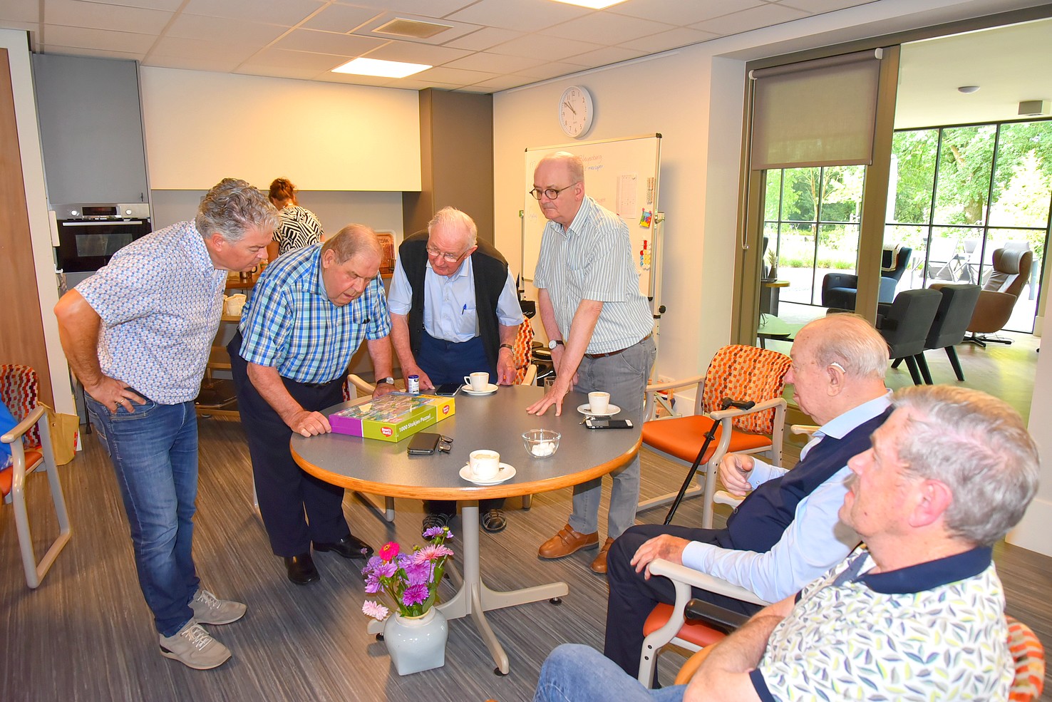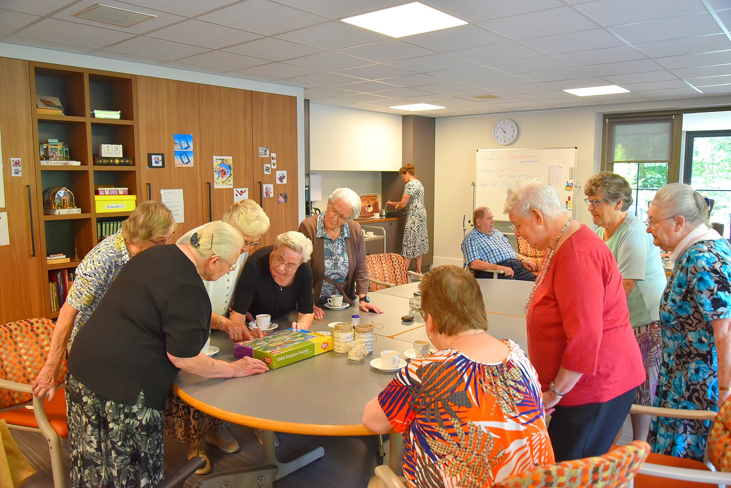 Woensdagmorgen 13 september kreeg deze prachtige actie een ‘officieel’ tintje. Jeanet Schouten en Evert-Jan van Egteren van Boon’s Markt Uddel waren naar de Wilhelminahof gekomen om het eerste exemplaar te overhandigen aan Kees Zwaan, voorzitter van Uddel Samen, en de oudste bezoekers van de dagbesteding, mevrouw Van den Broek en de heer Le Comte. Met deze puzzel kunnen de bezoekers van de dagbesteding in de Wilhelminahof hun hart ophalen en kijken of ze de afbeeldingen herkennen die er op de puzzel staan. En daar begonnen ze meteen mee. ’s Middags werd er al volop gepuzzeld.