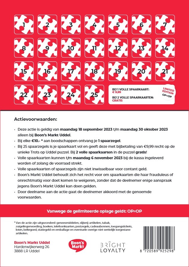 Mensen kunnen hiervoor sparen. Bij € 10* aan boodschappen krijgt men 1 spaarzegel. Bij een volle kaart van 25 zegels kan men de puzzel kopen met bijbetaling van € 10.00. Bij 2 volle spaarkaarten is de puzzel zelfs helemaal gratis. Dat lijkt misschien veel maar je kan maar liefst 6 weken sparen, dus voor onze trouwe klanten is dat prima te doen. Vanuit onze bakkerij komen er ook weekendaanbiedingen met extra zegel(s). Het is niet mogelijk om (tijdens de actie) de puzzel zonder zegels te kopen.