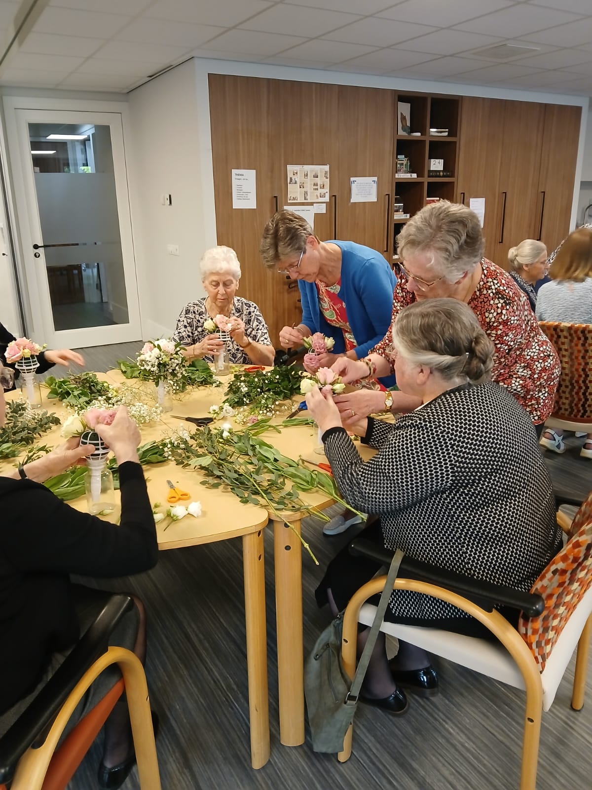 Daarna gingen de vrouwelijke bezoekers aan de slag om zelf een bruidsboeket te maken. De aanwezige heren bedankten daarvoor en deden liever een spelletje.
