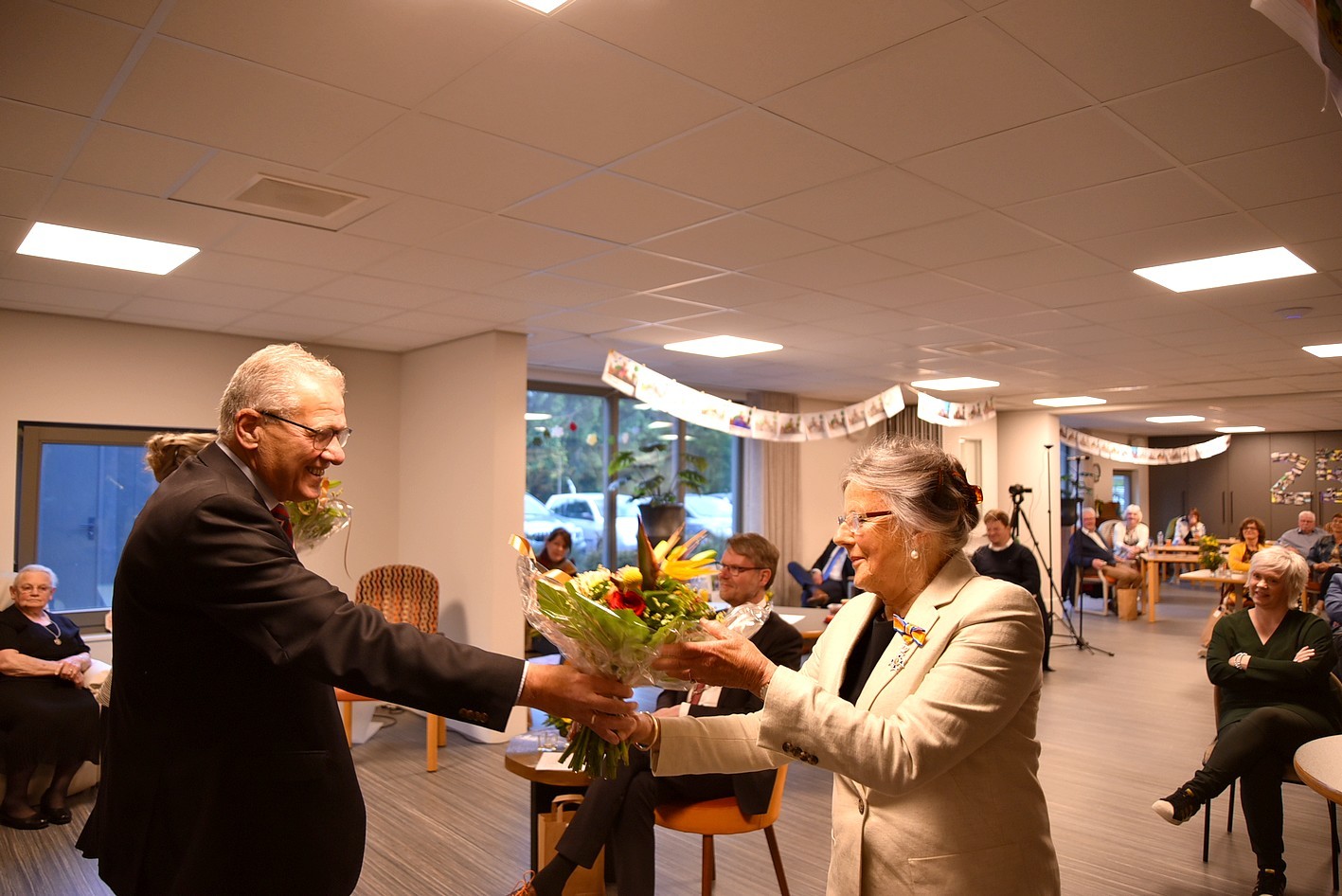 Hierna kreeg Kees Roos, nu oud-voorzitter SVHU, het woord en feliciteerde Coby en Gerrie met hun onderscheiding namens alle vrijwilligers van de SVHU, nu Uddel Samen en overhandigde beide een fotoboek met een boeket bloemen.