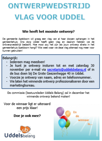Uddels Belang is ook aanwezig op de wintermarkt 13 november a.s. in het Blanke Schot! Heeft u vragen/opmerkingen/ideeën omtrent Uddel? Kom gerust eens bij ons langs en maak een praatje met een van de bestuursleden. Het is ook mogelijk om uw ontwerp van de vlag in te leveren die avond (uiterlijke inleverdatum 30 november), zie onze flyer hierover.