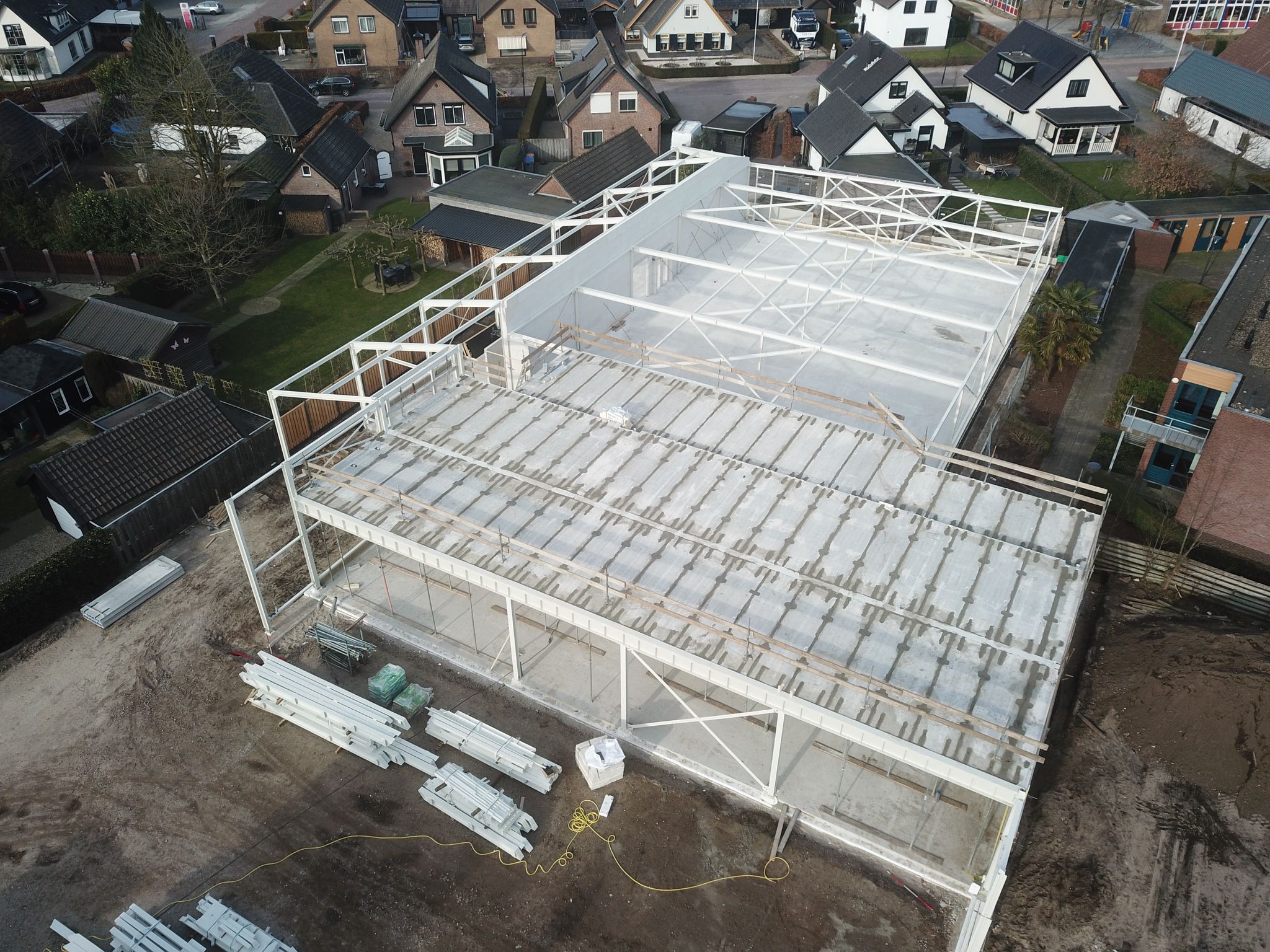 De foto in ‘vogelvlucht’ is van 2 weken geleden, inmiddels is de bouw alweer een stuk verder.