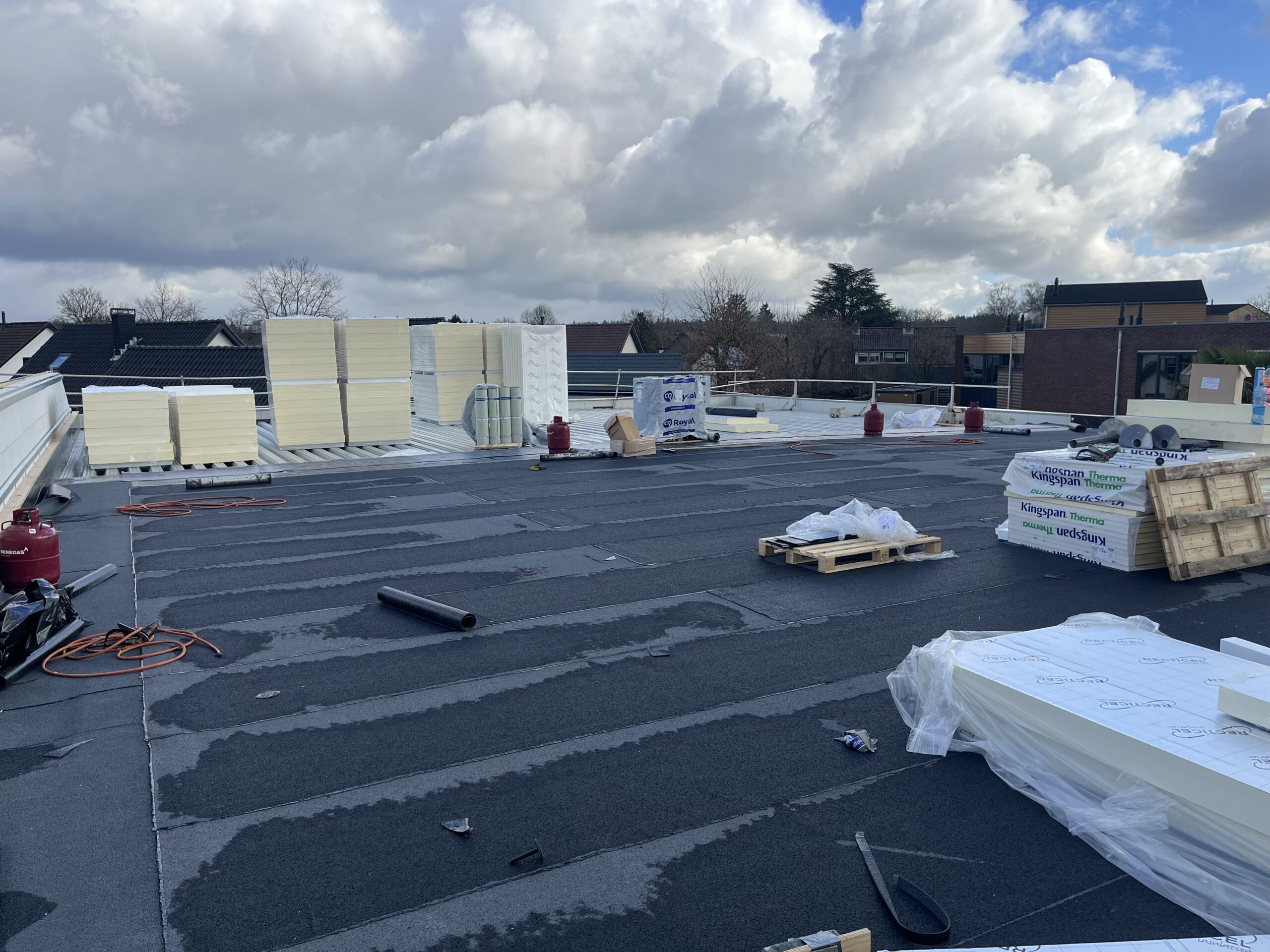 Dat zie is te zien op foto 2, die is van 12 maart waarbij het platte gedeelte van het dak dichtgeplakt wordt.