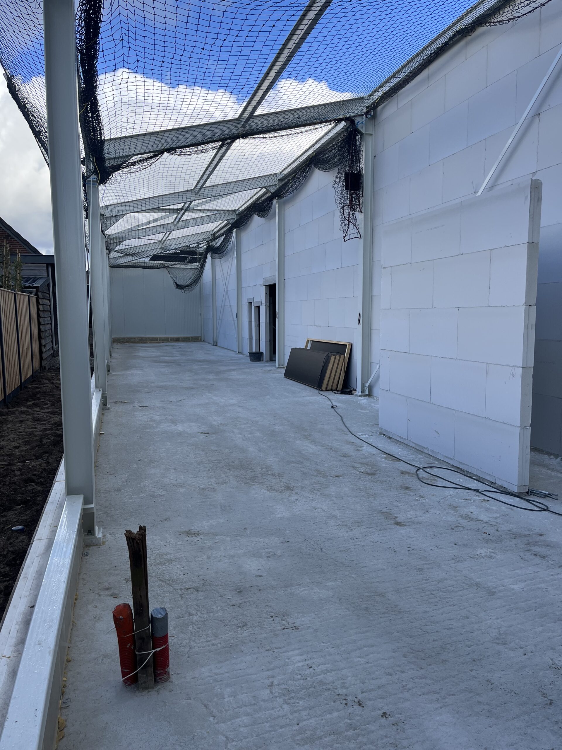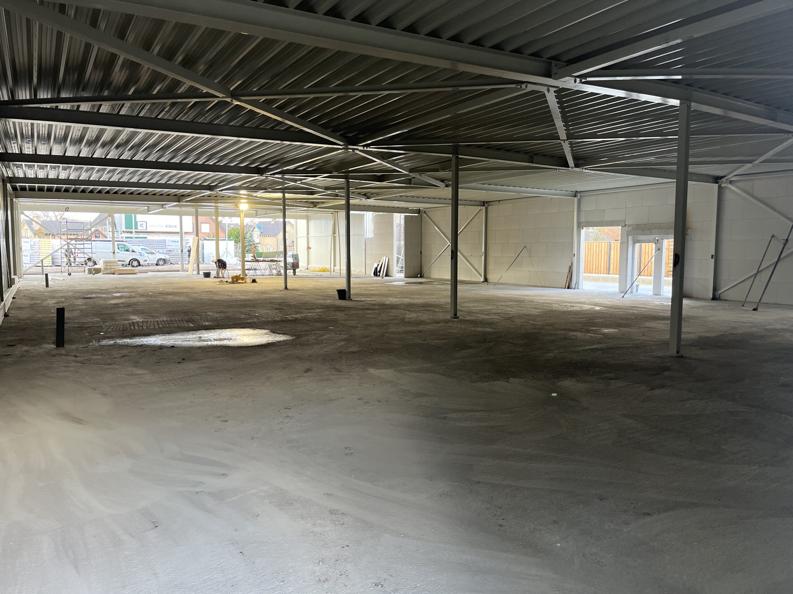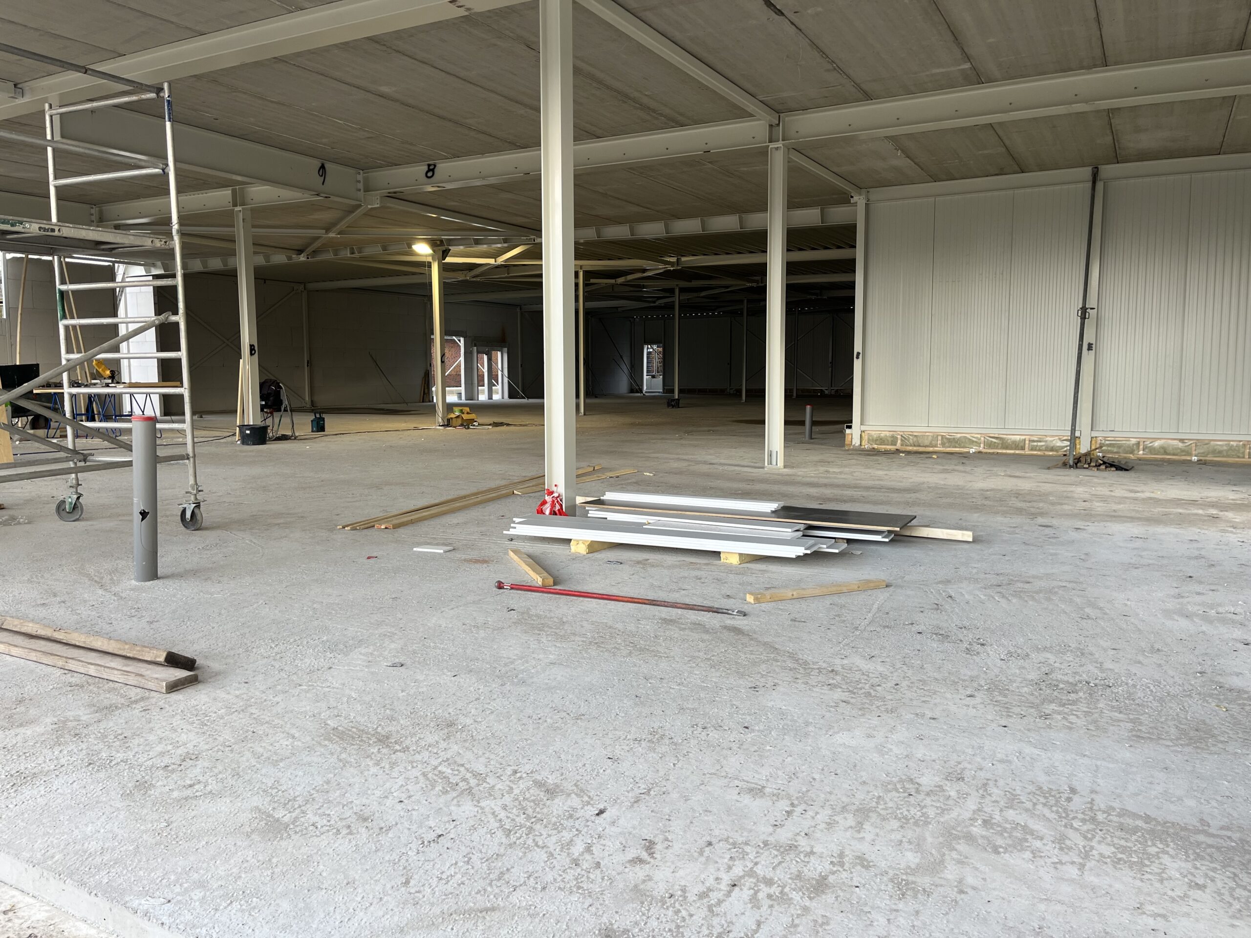 De derde foto geeft een blik van achter naar voren. Dit is het gedeelte waar de supermarkt komt, maarliefst 900m2 netto! Met slechts 1 rij pilaren die ‘slim’ ingepast gaan worden.
