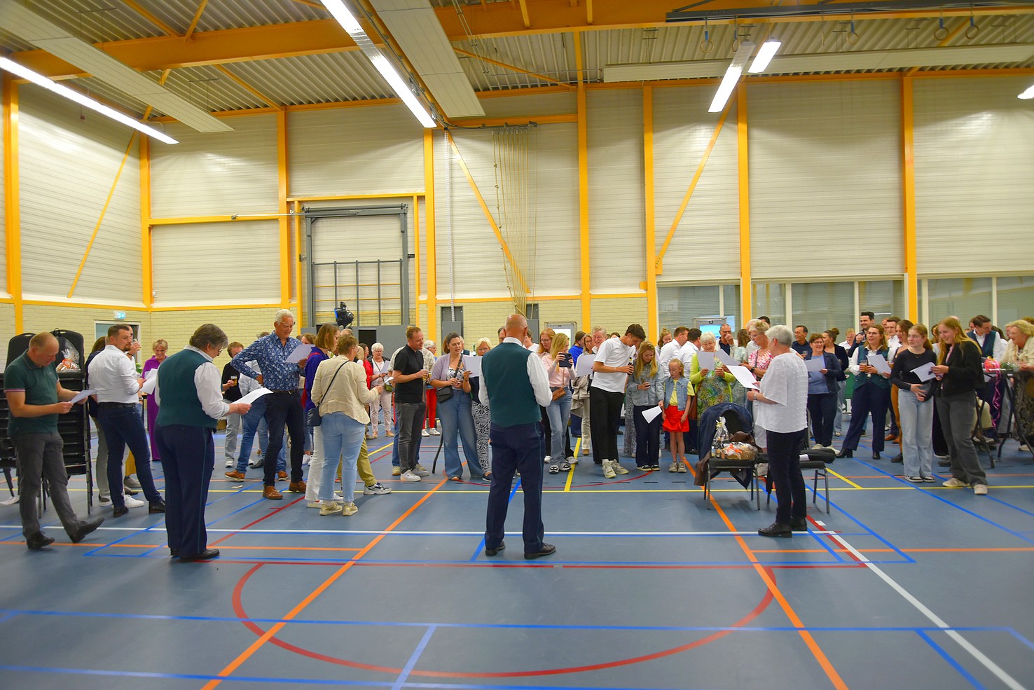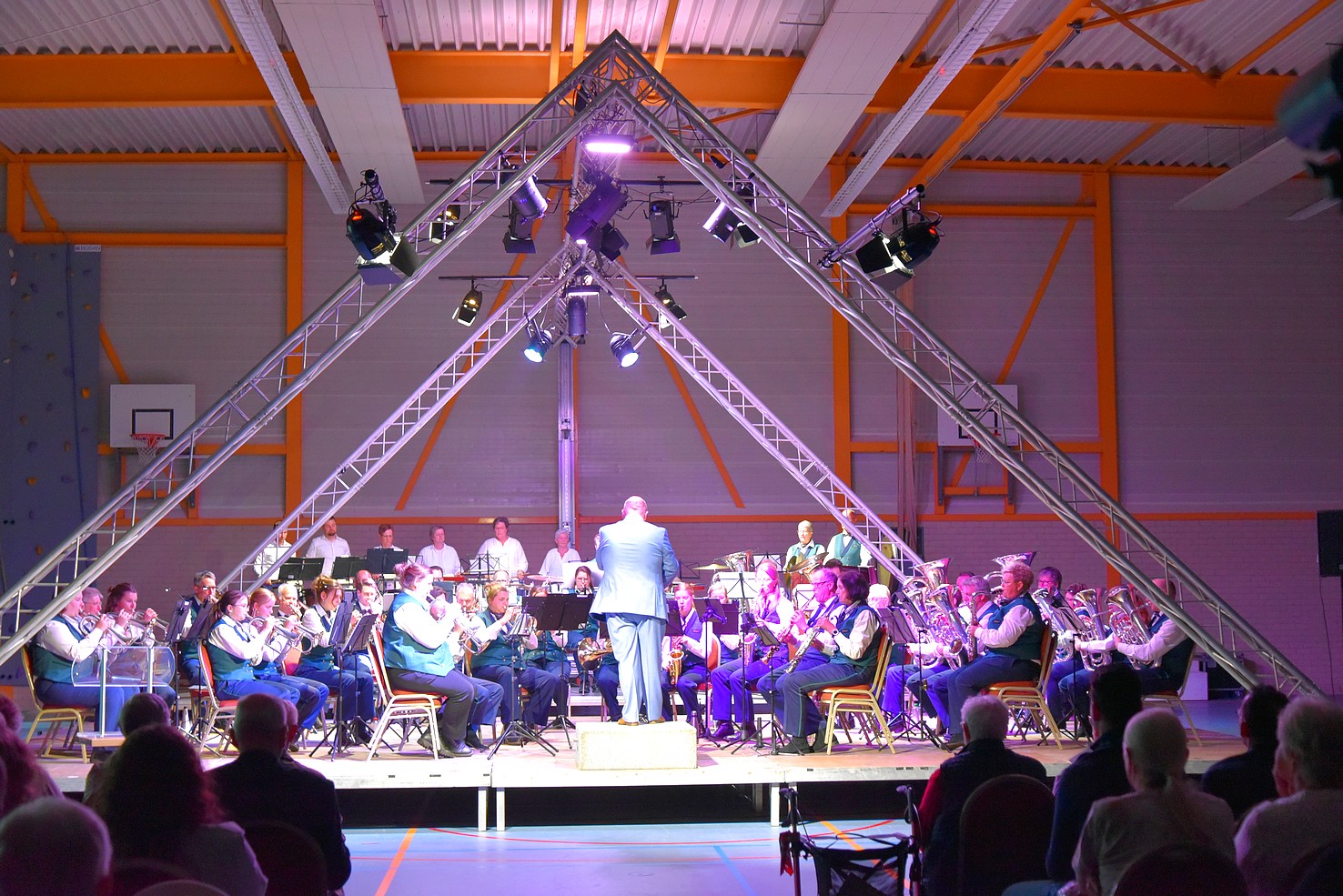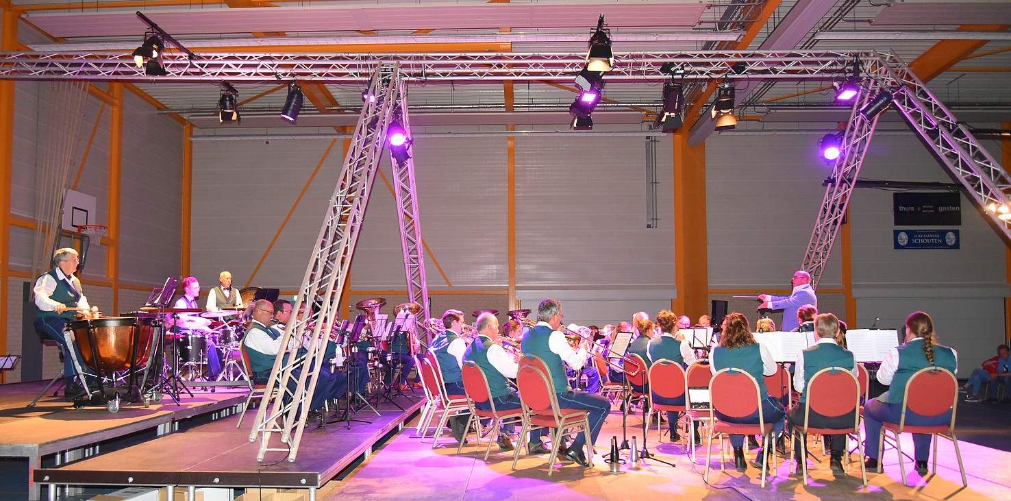 Zaterdagmorgen om 08.00 uur werd er al begonnen om van sporthal De Schier een echte concertlocatie te maken: podium erin, licht en geluid, stoelen, catering – er werd hard gewerkt om alles op tijd in orde te krijgen. De muzikanten van de fanfare kwamen om kwart over vier binnen om nog even te repeteren, gevolgd door de drumband. Hierna werd er een lekker broodje gegeten en even ontspannen.