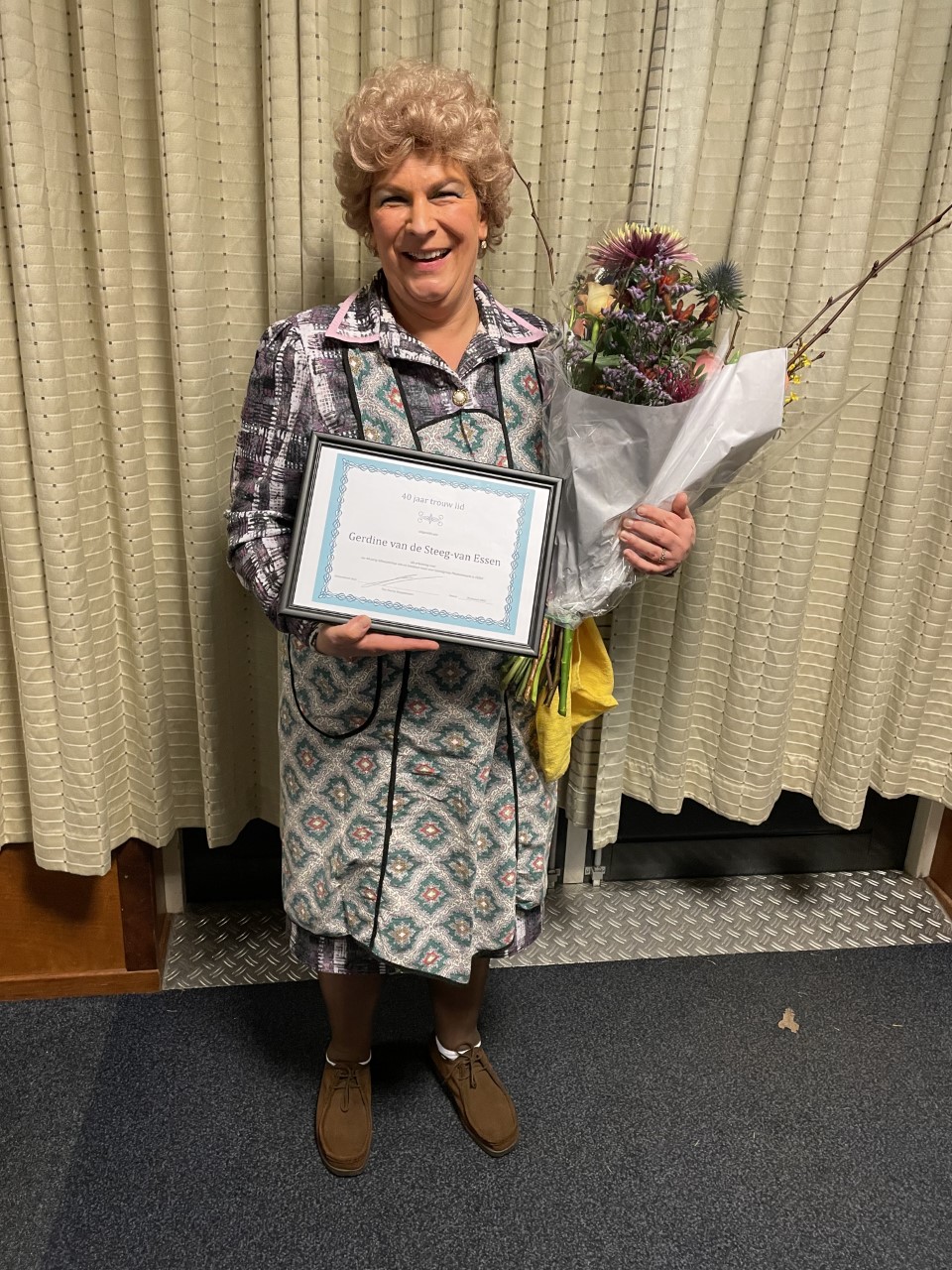 Dit jaar werd er een klucht gespeeld met de naam: een schat van een buste. Een geweldig toneelstuk en de lachsalvo’s klonken dan ook regelmatig door de zaal. Petje af voor alle spelers die stuk voor stuk fantastisch hun rol wisten neer te zetten. Er was echter één persoon die alle drie avonden uitblonk en dat was Gerdine van de Steeg want zij speelt dit jaar 40 jaar toneel! Wat een prestatie! Op vrijdagavond werd ze verrast door haar kinderen en kleinkinderen. Zaterdagavond kreeg ze namens alle leden van Plankenkoorts een cadeaubon. Maar afgelopen zaterdag kon spande toch wel de kroon. Nadat ze van voorzitter Gerben van de Ridder een prachtige foto overhandigd had gekregen, nam Dorianne van den Brink het woord over en zij nodigde de voorzitter van Uddels Belang; Frank van de Kolk uit om op het podium te komen. Deze hield een toespraak en vervolgens overhandigde hij aan Gerdine een oorkonde namens het college van B&W van de gemeente Apeldoorn voor haar tomeloze inzet voor het toneel. Verbazing en verrassing alom! Een prachtige afsluiter van drie prachtige toneelavonden.