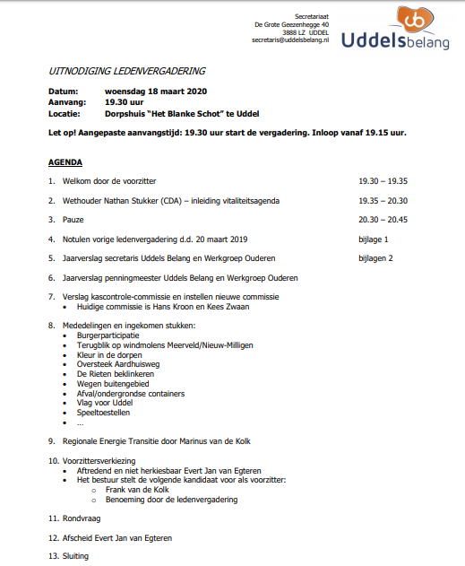 UDDEL – Uddels Belang nodigt alle leden van de vereniging uit, om de ledenvergadering op 18 maart 2020 bij te wonen. Deze ledenvergadering zal aanvangen om 19.30 uur en de zaal is geopend vanaf 19.15 uur.