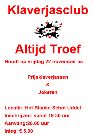 Klaverjasclub Altijd Troef houdt aanstaande vrijdag 22 november prijsklaverjassen en jokeren bij het Blanke Schot in Uddel. Het is mogelijk om in te schrijven vanaf 19.30 uur en de aanvang is 20.00 uur. Inleg voor dit toernooi is €5.