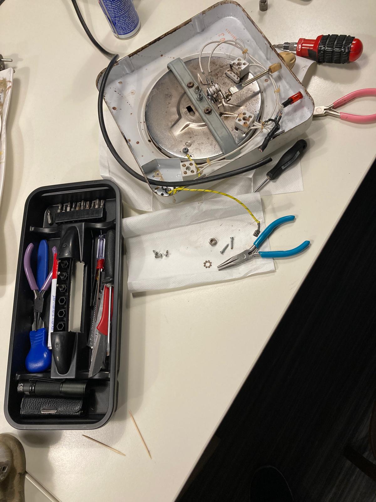 We maakten het plaatje open en zagen dat de temperatuurknop was losgeschoten. Die zat gelukkig zo weer vast. Ook de bedrading was erg slecht en we hebben die vervangen. De inwoner van Uddel ging tevreden naar huis met een goed functionerend warmhoudplaatje. Het plaatje kon weer dienst doen om iets warm te houden en is misschien wel gebruikt om de jaarlijkse oliebollen te bakken.