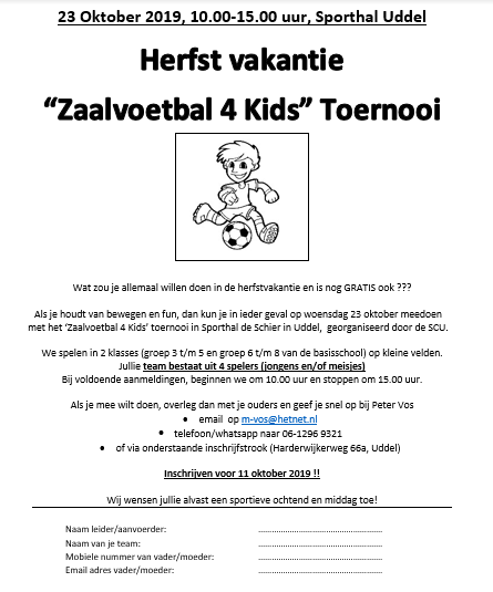 Als je houdt van bewegen en fun, dan kun je in ieder geval op woensdag 23 oktober meedoen met het ‘Zaalvoetbal 4 Kids’ toernooi in Sporthal de Schier in Uddel, georganiseerd door de SCU.