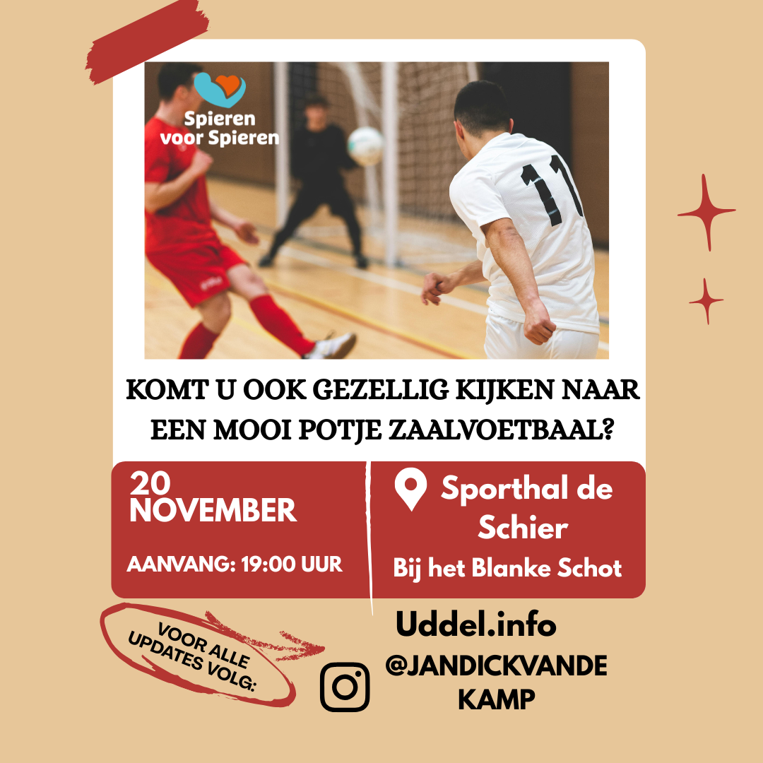 UDDEL – Komende donderdag 20 november is het zover: het zaalvoetbaltoernooi voor Stichting Spieren voor Spieren. Zeven teams nemen het donderdagavond tegen elkaar op.