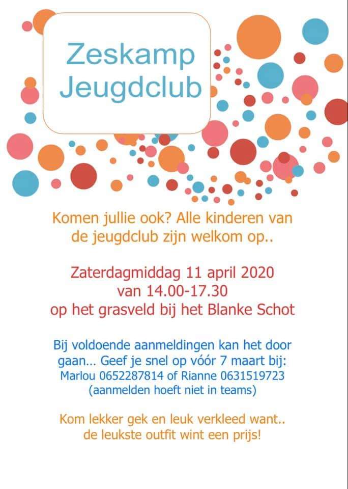 Op 11 april organiseert de Jeugdclub een zeskamp bij het Blanke Schot. Deze middag is voor kinderen van de Jeugdclub in de leeftijd van 7 t/m 15 jaar. Geef je snel op vóór 7 maart bij Rianne Kroneman en Marlou Pul. De zeskamp gaat alleen door bij voldoende aanmeldingen!